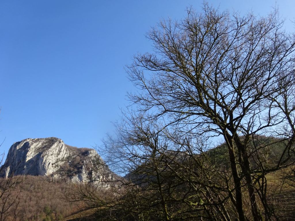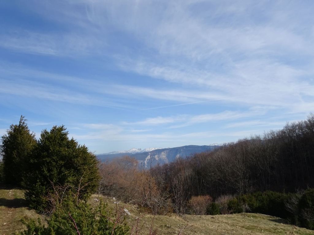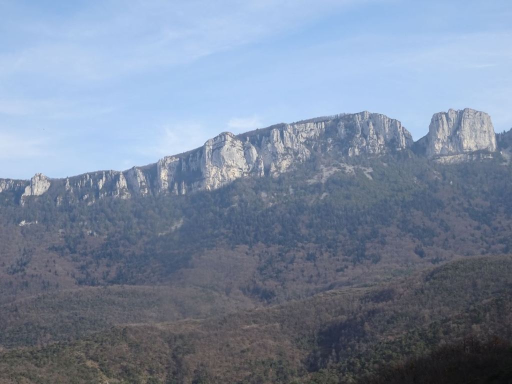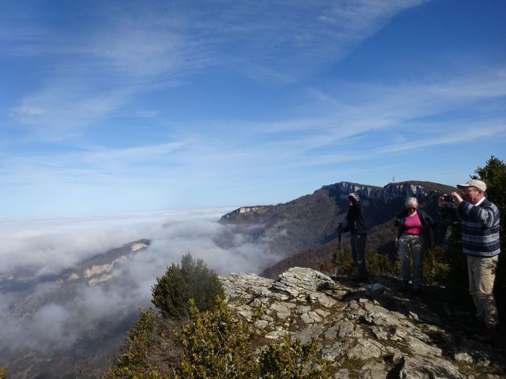 Mardi matin 21 février, à 8h30, les 4 mousquetaires (Brigitte et Brigitte, Yvon et Jim ) – sous un ciel gris – sont partis randonner. Notre destination ? Le village de Rochefort-Samson. En arrivant à notre point de départ : nous nous sommes garés au col (de St Cécile?) – nous avons découvert un paysage splendide baignant dans une lumière fraîche et c’est sous un soleil et un fond de ciel d’un bleu intense que nous avons baladé toute la journée. Nous sommes montés en direction du col qui descend à Beauregard-Baret et ensuite nous avons pris la direction du Pas de Pierre. C’est une pente très raide, et malgré deux ou trois « taches » de neige nous n’avons pas pas eu de problème pour atteindre le Pas qui est bien caché entre les arbres parmi les falaises de la montagne de Musan. Nous avons pris une petite pause pour monter au-dessus du Pas – sur le sentier qui part en direction de Pas Pourçain. La vue était magnifique comme une mer de nuages en direction de Valence et à l’est on voyait bien les montagnes (peu enneigées) du Vercors.