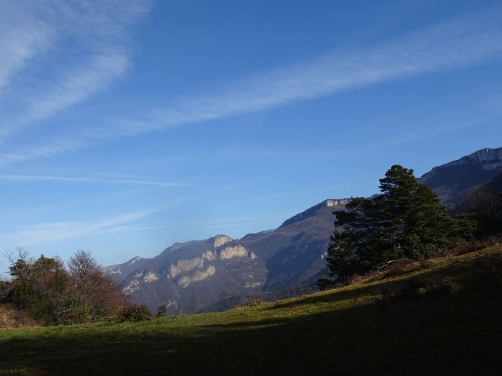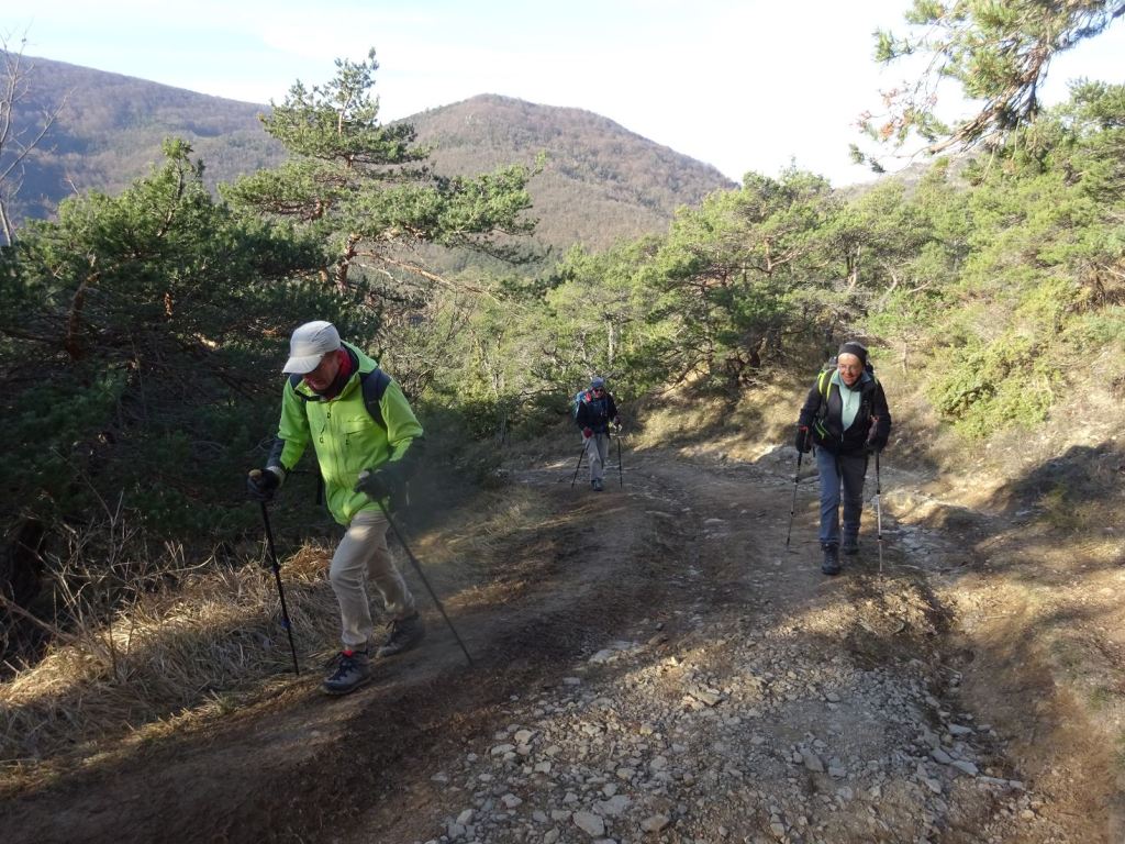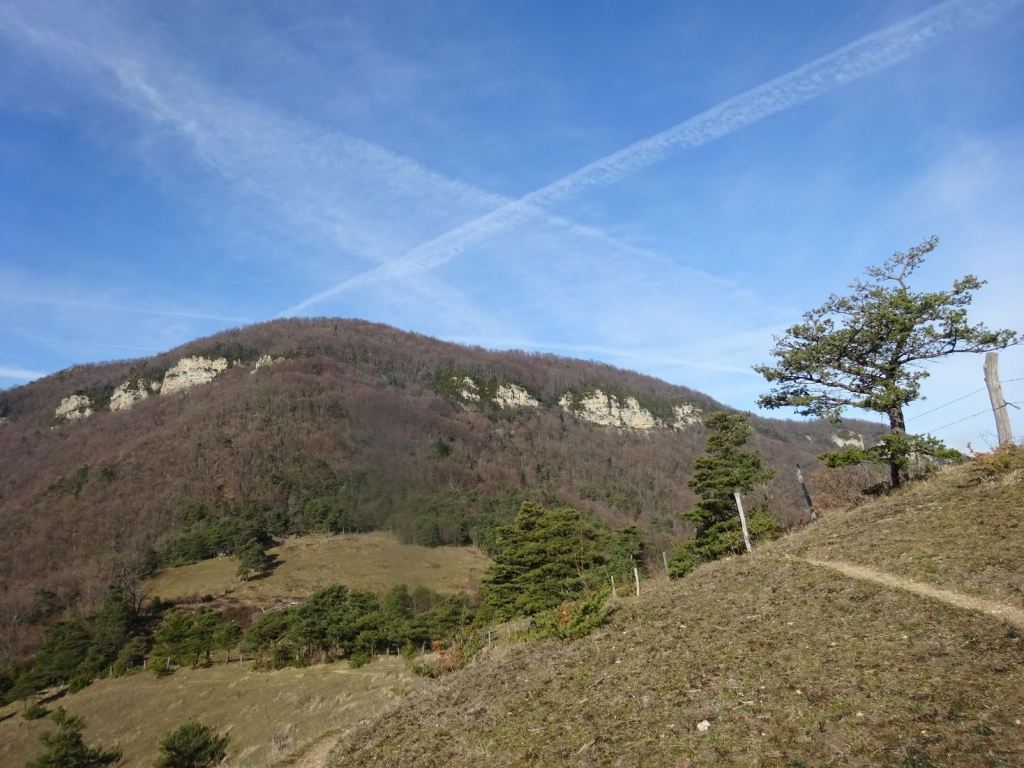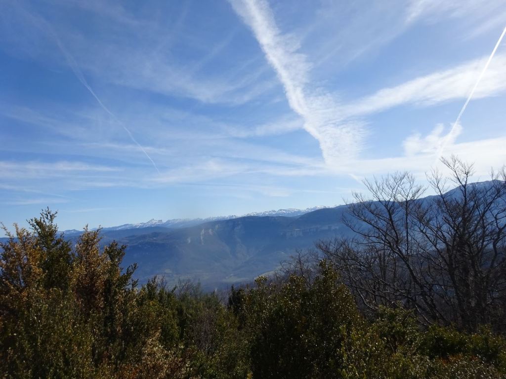 Mardi matin 21 février, à 8h30, les 4 mousquetaires (Brigitte et Brigitte, Yvon et Jim ) – sous un ciel gris – sont partis randonner. Notre destination ? Le village de Rochefort-Samson. En arrivant à notre point de départ : nous nous sommes garés au col (de St Cécile?) – nous avons découvert un paysage splendide baignant dans une lumière fraîche et c’est sous un soleil et un fond de ciel d’un bleu intense que nous avons baladé toute la journée. Nous sommes montés en direction du col qui descend à Beauregard-Baret et ensuite nous avons pris la direction du Pas de Pierre. C’est une pente très raide, et malgré deux ou trois « taches » de neige nous n’avons pas pas eu de problème pour atteindre le Pas qui est bien caché entre les arbres parmi les falaises de la montagne de Musan. Nous avons pris une petite pause pour monter au-dessus du Pas – sur le sentier qui part en direction de Pas Pourçain. La vue était magnifique comme une mer de nuages en direction de Valence et à l’est on voyait bien les montagnes (peu enneigées) du Vercors.