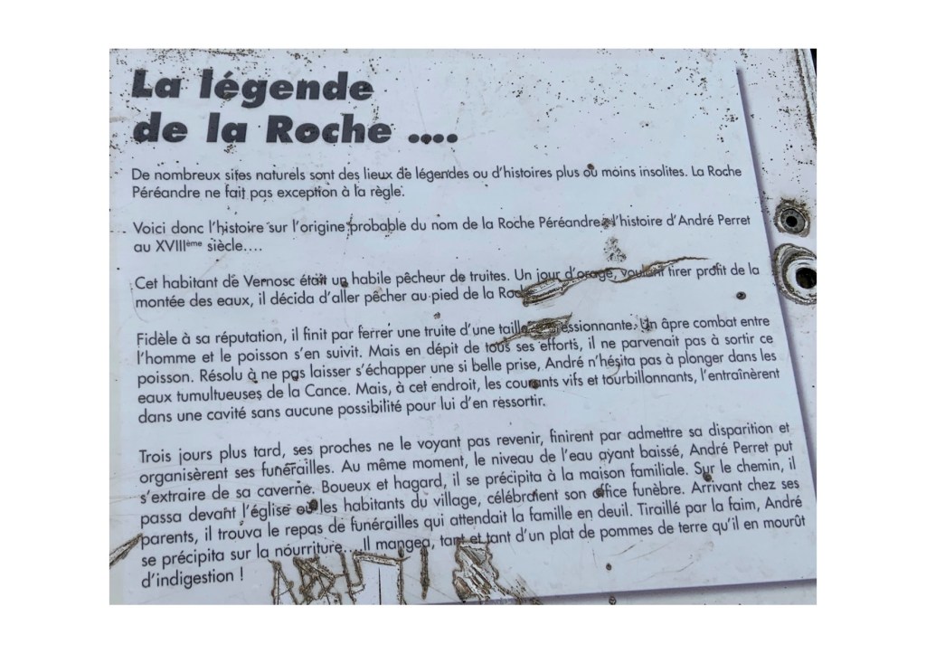 Nous revenons sur le GR qui nous fait découvrir un premier joli pont pour traverser la Cance . En montant en direction de Vernosc lès Annonay, un beau talus ensoleillé nous accueille pour le pique nique. Un vent fort se lève… (et nous avec !) et nous repartons par Vernosc-lès-Annonay en direction la Roche Péréandre, beau rocher de 39 m de haut avec à son pied la Cance.