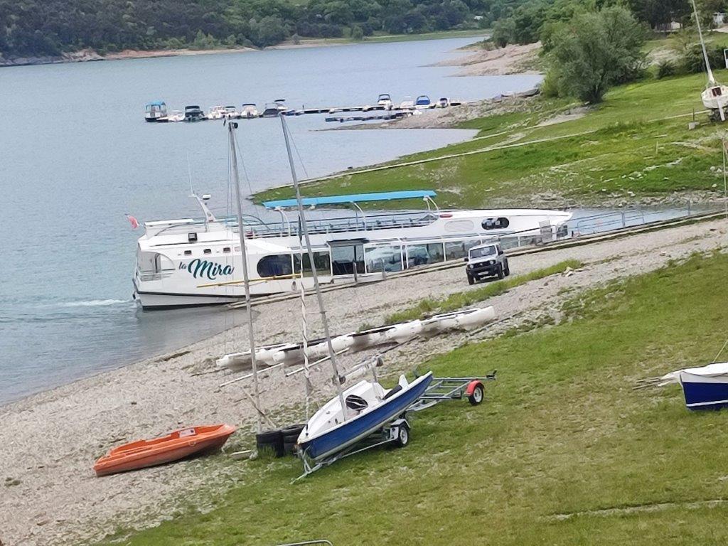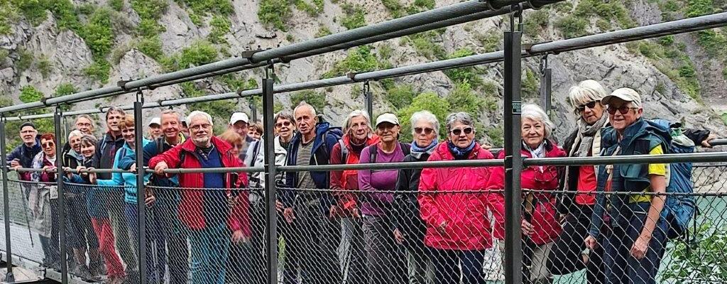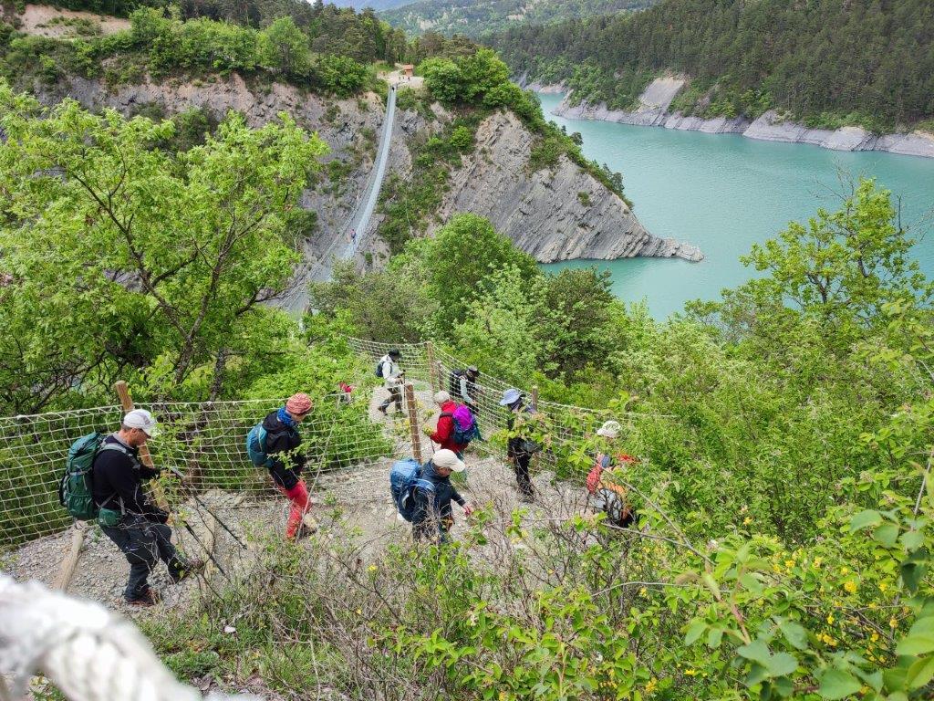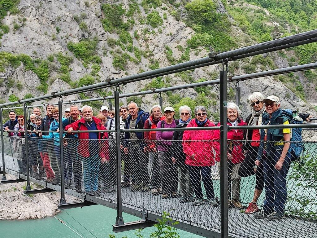 Vendredi 12 mai, fin du séjour, rendez vous pour les 28 Chamberliens à l’embarcadère de Treffort où le « Mira » nous fait traverser le lac Monteynard. Il permet en effet d’effectuer un tour du lac à pied, impossible autrement. La traversée de deux passerelles himalayennes nous attendaient sur un parcours assez sportif. Un temps sec, une bonne ambiance sur les passerelles mouvantes et des vues magnifiques sur le lac terminaient ainsi notre séjour. Retour à bon port sur Valence juste après l’orage.