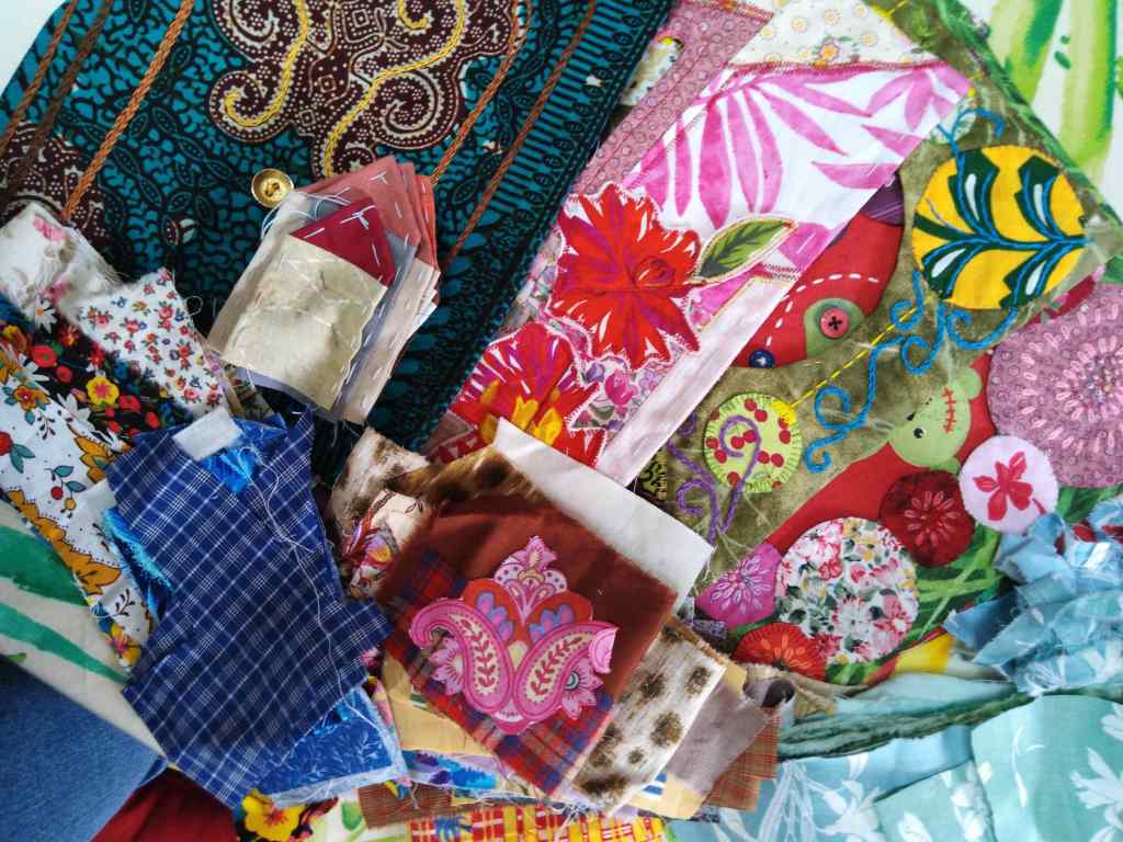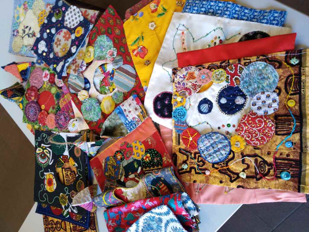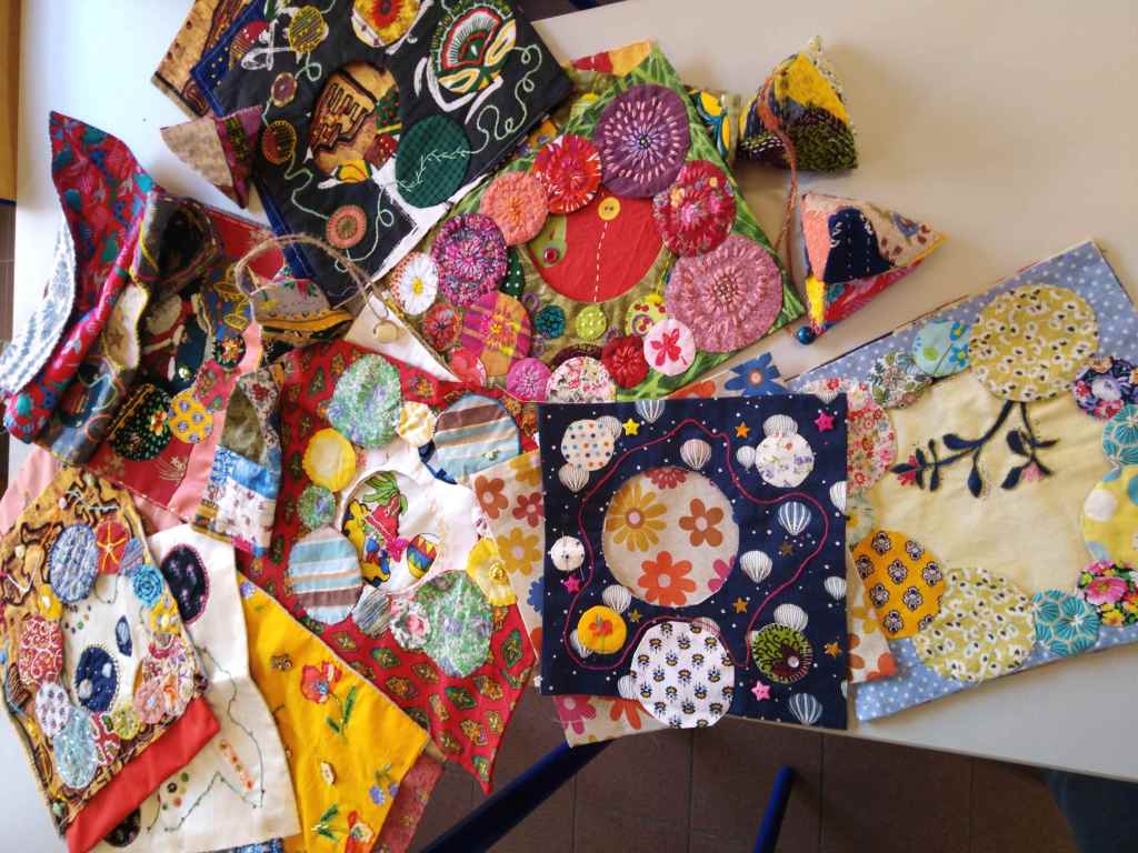 Depuis janvier, on a sélectionné des tissus, découpé des motifs, assemblé, appliqué, maintenu à plat et embelli des pages textiles tunnels. Et on a bien étudié la chose pour en faire un livre pour chacune. Et dans un esprit de détente, on a confectionné des petits sacs pyramides, genre de pochettes pour contenir ou offrir des petites bricoles comme des boutons, des bijoux, des pièces…