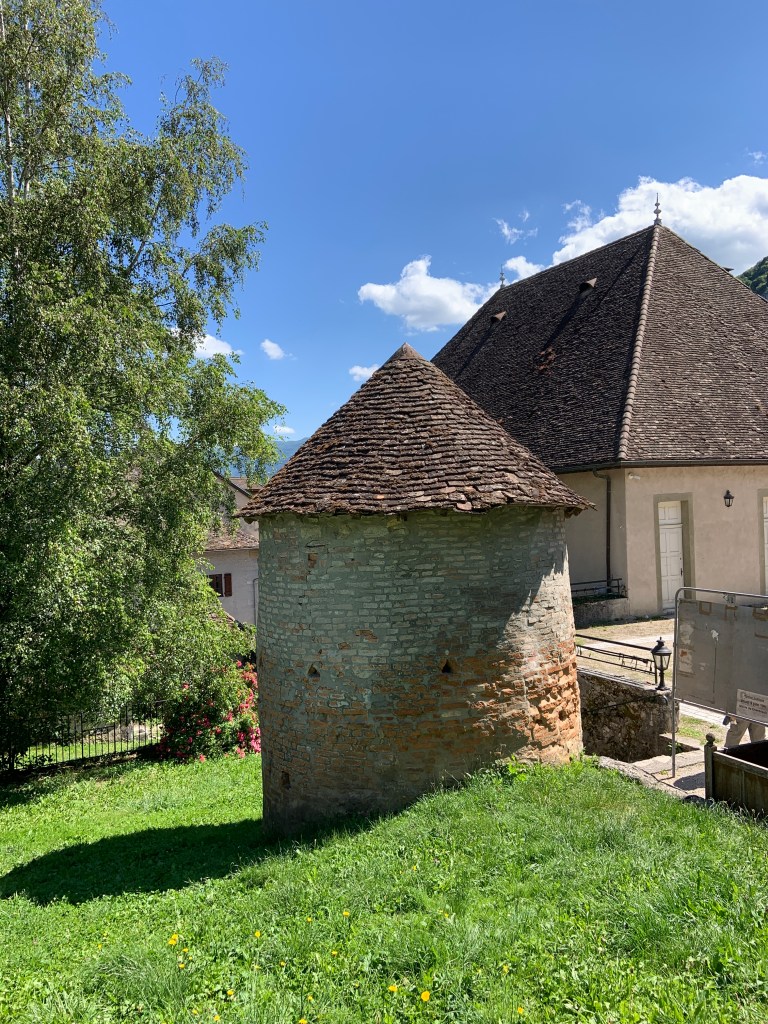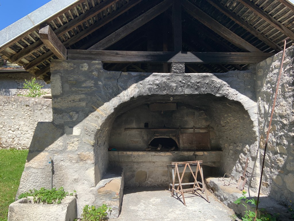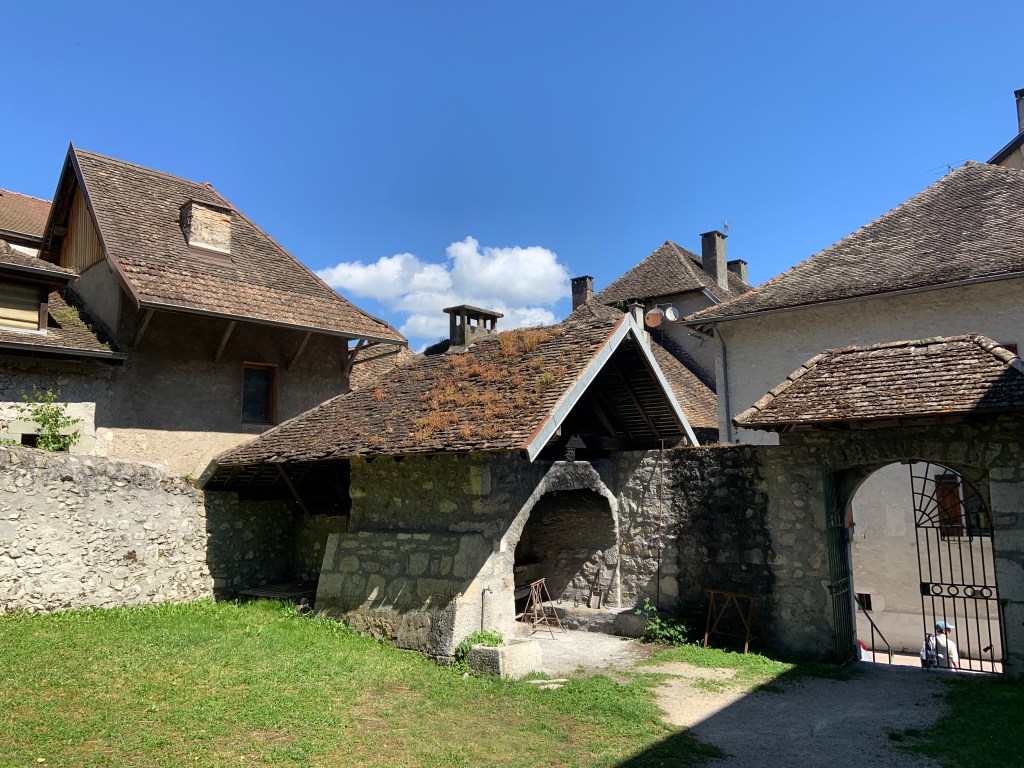 Arrivée au village savoyard de Chanaz à 10h15 pour une visite libre et le passage obligé à son moulin. Jadis se dressaient trois moulins à Chanaz. Le plus ancien dont subsiste encore la roue, enchevêtrée dans la végétation, fut abandonné après la construction des deux autres. Celui situé en aval est aujourd’hui détruit ; le dernier, en état, fonctionnait encore au début du siècle. Ce moulin produisait de la farine et de l’huile. Il est alimenté par un ruisseau appelé “le Biez”, dont les eaux retenues en amont par une vanne, forment une mare : “La Torna”. La manipulation de la vanne permettait de faire mouvoir la roue à volonté.