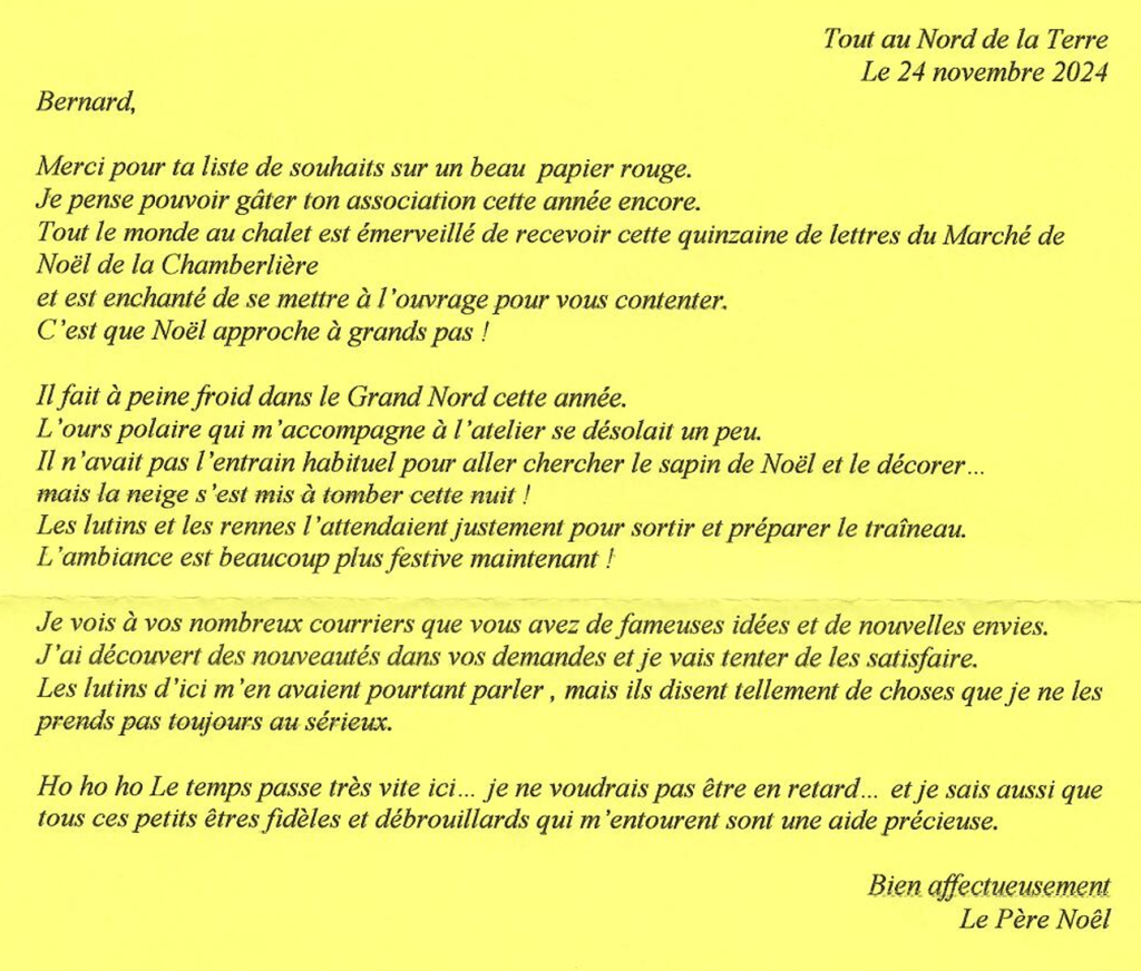Ces lettres lui ont été adressées dès le lendemain et l’association des Chamber’liens vient de recevoir une réponse provenant « Tout au Nord de la Terre ».