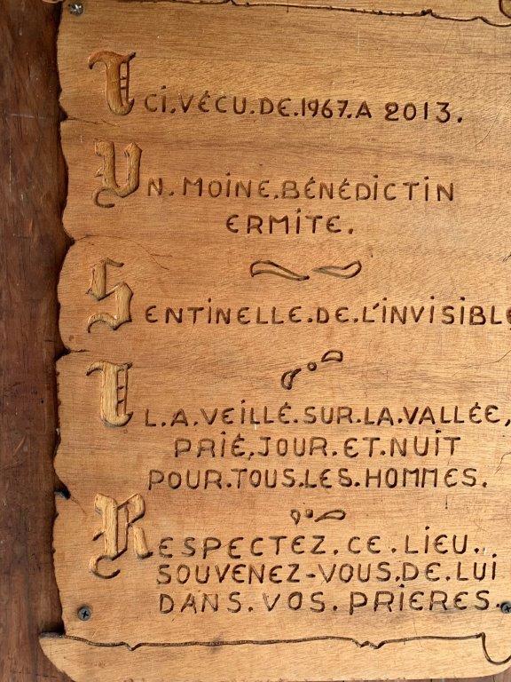 « Son ermitage était une petite cabane de planches, de la taille d’un abri de jardin, sans confort et sans électricité bien sûr. Le Père disait plaisamment qu’il avait l’eau courante, en désignant la source qui sourdait une cinquantaine de mètres en contrebas de son ermitage (avec une pente avoisinant les 80%). Pour rendre visite au Père Marie-Grégoire, il fallait laisser son véhicule sur la place de Saint-Andéol en Quint, près de la minuscule église, puis, par un chemin étroit – malaisé en certains passages …………