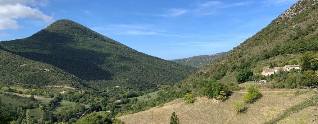 3 Chamber’liens (Jim, Régine et Bernard S) étaient au départ à 8h, par ce beau mardi ensoleillé. Au programme les hameaux d’Eygluy et de L’Escoulin dont on ne se lasse décidément pas… Autrefois 2 communes séparées dans deux vallées parallèles, jusqu’à leur fusion en 1971. Départ de la rando depuis Eygluy, passage au hameau les Tourniers puis au col de Fonteuse (817m), d’où l’on redescend par la côte Marnier, jusqu’à la passerelle de L’Escoulin. Petite halte à la fontaine du village. Puis destination son église, juchée sur son promontoire et adossée au cimetière de la paroisse Saint Pierre de la Sépie (nom du petit ruisseau en fond de vallée). Coin idéal pour la pause de midi devant une vue splendide sur l’ensemble de la vallée. Devant nous 2 sommets le Taillefer (932m) à notre gauche dont nous avons fait le tour vendredi avec Bruno et le Merly (959m) à notre droite qui nous fait de l’œil depuis le début de notre rando. Une fois restaurés (chocolat et verveine en bonus), la rando se poursuit en direction du col de Véraut (690m). La montée s’est faite allègrement et nous avions encore des fourmis dans les jambes pour une petite variante chère à qui vous savez… Depuis le col nous avions repéré un chemin pour contourner le Merly. Après un soigneux examen du profil de ce tracé imprévu et surtout une large concertation avec tous les participants… nous voici partis pour cette boucle supplémentaire que nous vous recommandons pour de belles vues sur Plan de Baix et la Croix du Vellan, Beaufort sur Gervanne et la Combe de Laye.