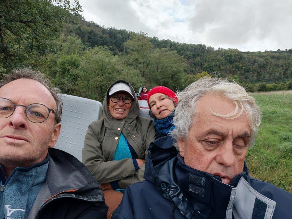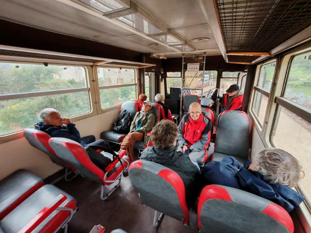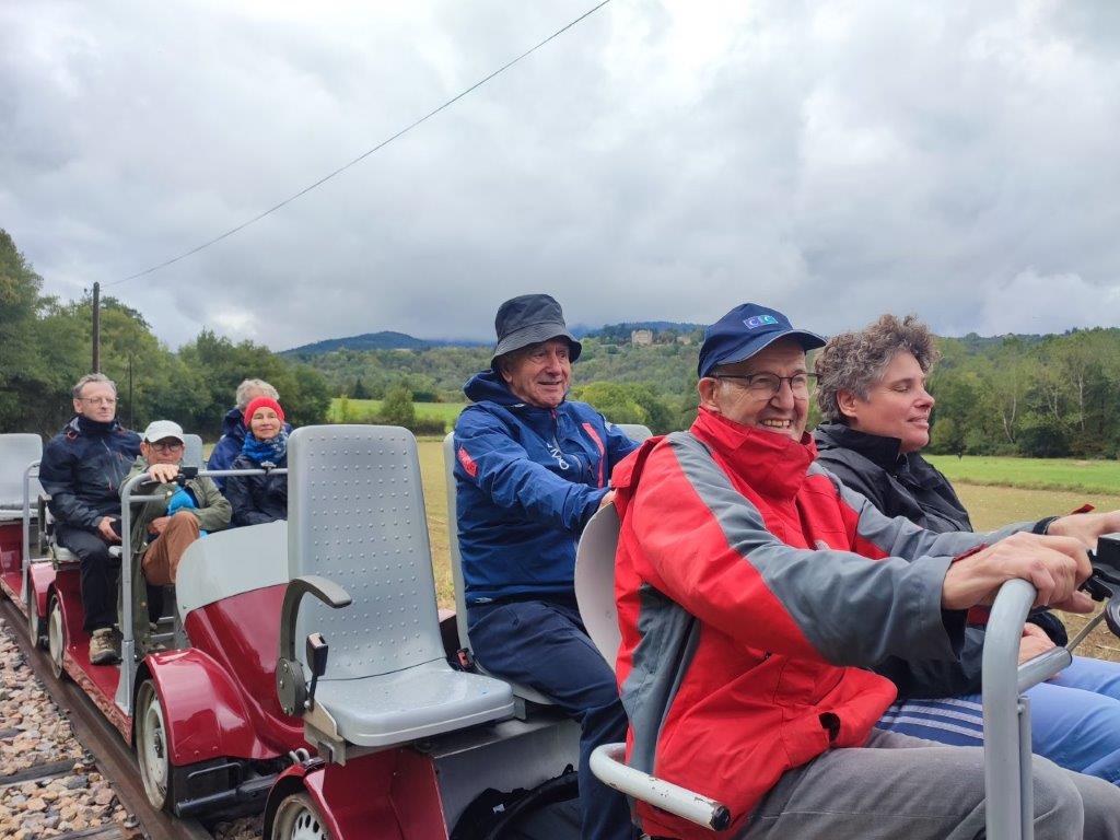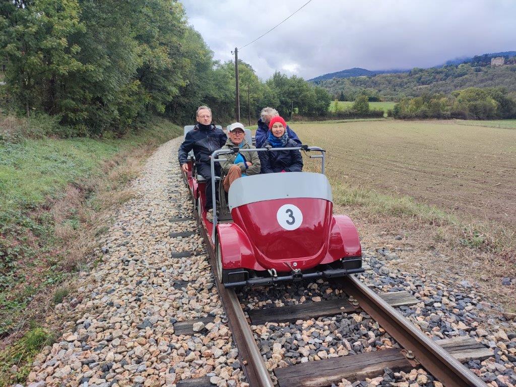 Le mercredi 24 septembre, avec les mal-voyants, il avait été convenu d’aller prendre les vélos-rails du Mastrou, le petit train de l’Ardèche au départ de Boucieu-le-Roi. Le temps n’était pas au rendez vous. La pluie du matin présageait le pire mais notre réservation de billets ni remboursables, ni échangeables nous oblige à tenter le diable. Guilaine, Christophe, Fabien, Christiane I, Josette R, Jean S, et Robert restent confiants après avoir consulté la météo.