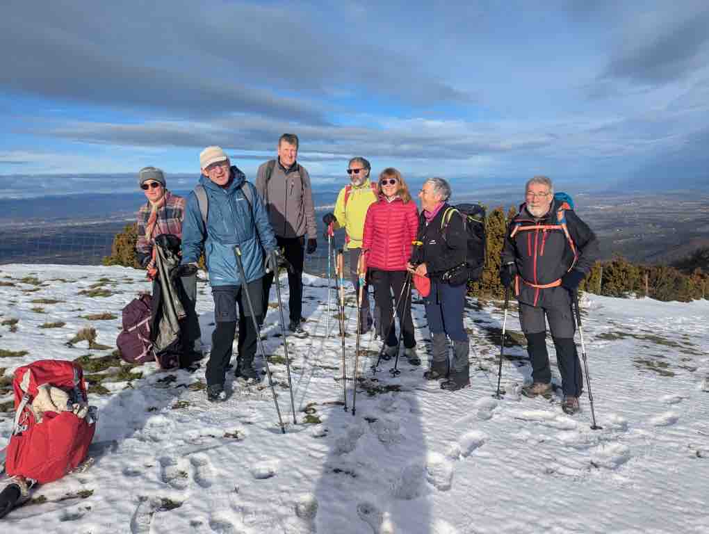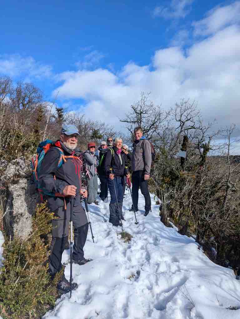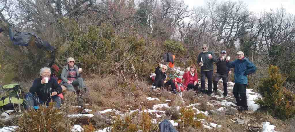 Si arrivé au pont culminant (antenne) j’ai eu la faiblesse un instant de vouloir prendre la route , l’ambiance positive de la troupe m’a vite fait changé d’avis et nous avons donc continué sur le GR où l’effet conjugué du changement de versant et de couvert végétal nous a permis de marcher normalement avec toutefois quelques passages escarpés et quelques points de vue sur la plaine de Valence, sur le Vercors et les Trois Becs .