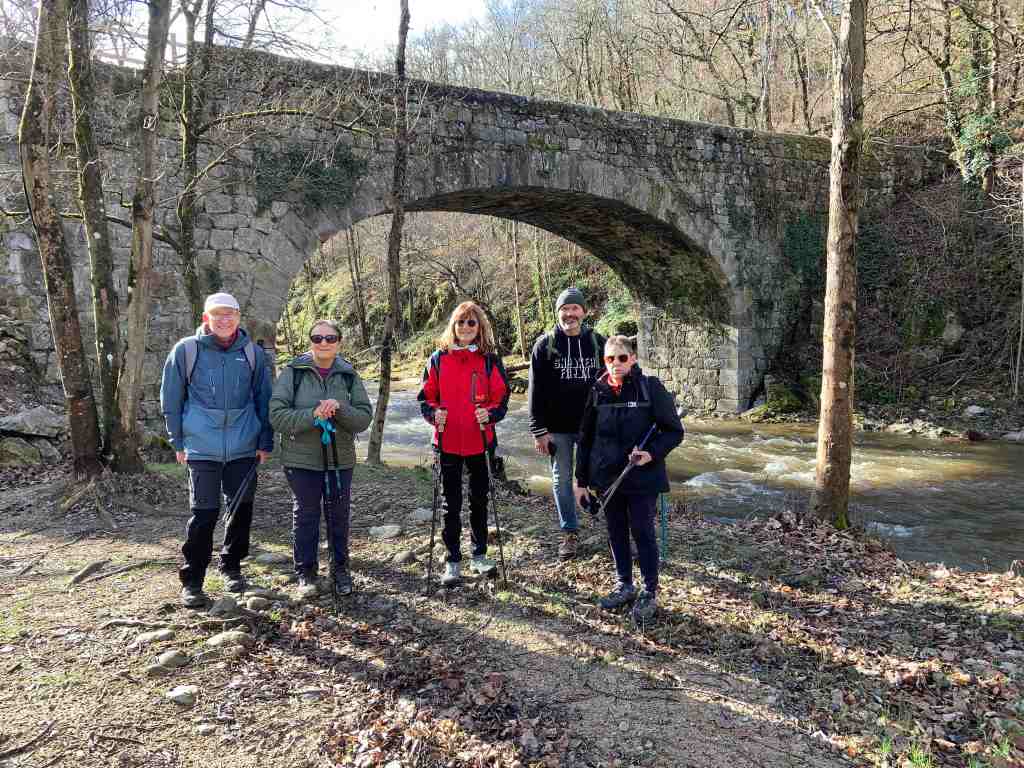 Après une brève descente du village, nous avons traversé la rivière L’AY au camping de l’Oasis, profitant de la passerelle des estivants. Nous aurions eu beaucoup de difficultés à la traverser par un gué tant le niveau de l’eau était élevé et le courant rapide… Le soleil a décidé de se montrer assez vite et nous a accompagné un bout de chemin… Notre parcours a ensuite suivi son cours jusqu’au ravin de St Pierre dont le pont du même nom, bien restauré par les Amis de St Pierre, nous a permis une nouvelle fois de traverser à pieds secs ((ouf !)).