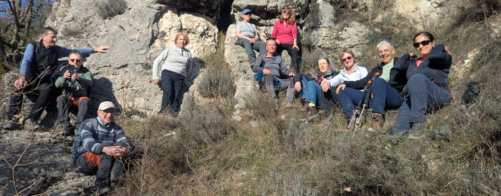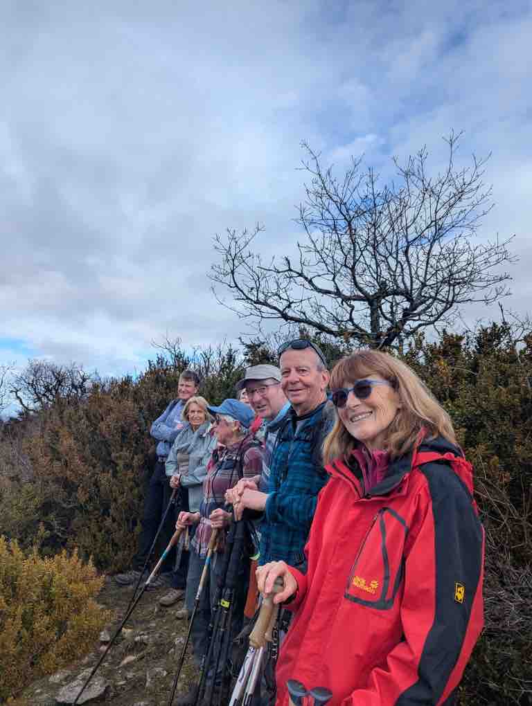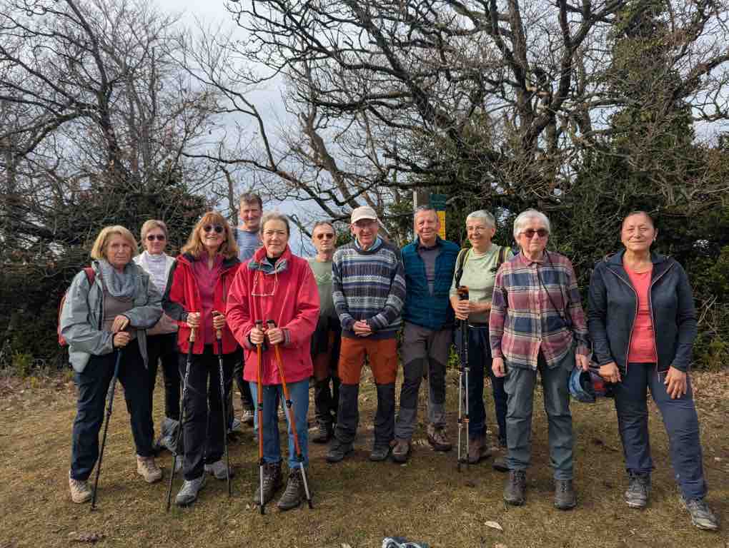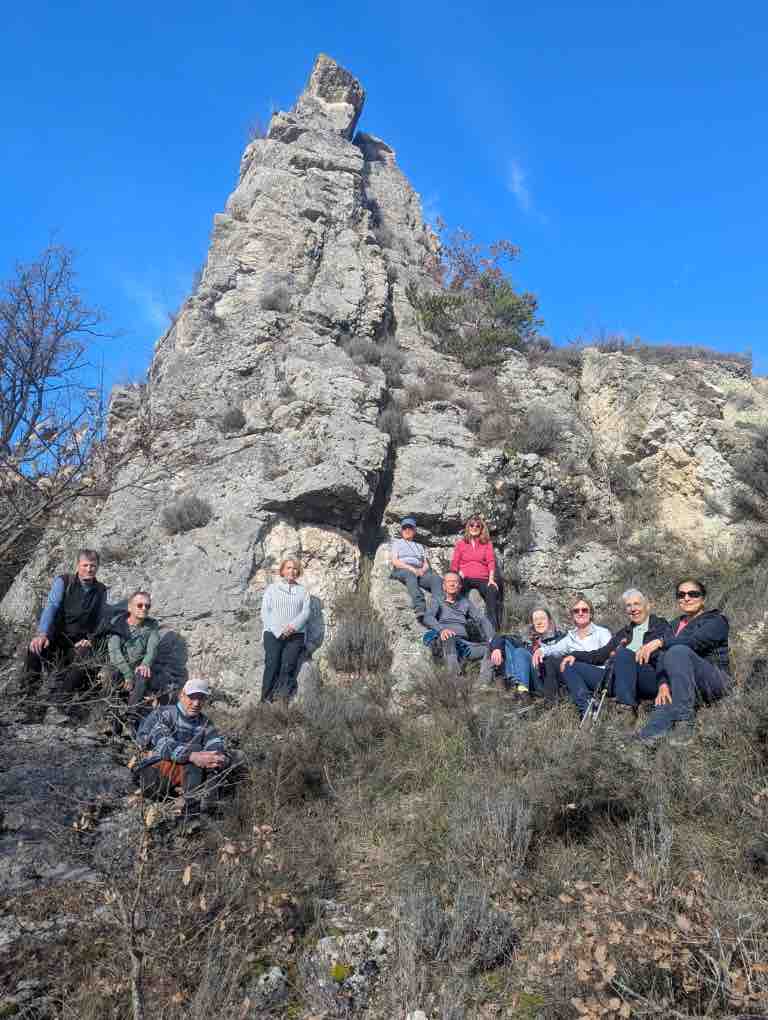 En quittant le sentier menant à Combovin nous avons pris des petits sentiers en contournant par le nord le serre Giraudon pour atteindre le fameux point 394. Le soleil étant revenu, il a été décidé unanimement de poursuivre jusqu’aux Pialoux par un agréable sentier contournant par le sud le serre Peyrochard et finir la randonnée comme nous l’avions débutée en longeant la crête d’où émergent des roches fièrement dressés verticalement. Nous n’avons pas pu nous empêcher de poser devant ce paysage magnifique en fin de randonnée.