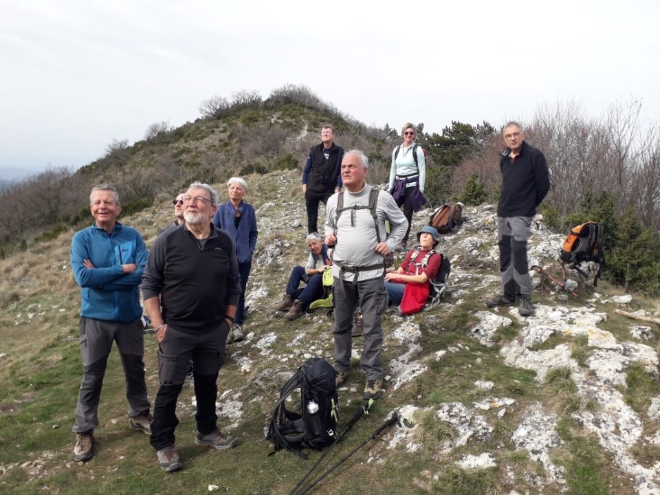 Allez il faut marcher, on monte parfois raide, en zig-zag, d’abord entre les arbres ensuite on traverse un terrain rocailleux et 2 heures après notre départ on se retrouve à la Pas de Berlhe à 884m , on a chaud , on pose les sacs et on fait un aller-retour à la petite pommerolle, avec vue -surprenant – du village de Saoû. Il fait pas mauvais, il fait pas beau, ciel voilé. Et maintenant avant qu’on casse la croûte il faut qu’on monte sur la Grande Pommerolle, selon le panneau qui se trouve au pas de Berlhe elle est à 600m,, mais le panneau n’indique pas qu’il y a 200 m de dénivelé à faire. Et donc on transpire et de temps en temps on s’arrête , vue magnifique en direction de Roche Colombe, autour de nous les hêtres sculptés par le vent ( mais il n’y a pas de vent aujourd’hui).On arrive, Et là avec vue vers le sud – direction Bordeaux – on s’assoit et on mange un repas bien mérité. A la fin du repas Bruno Legrand nous a offert un verre de Clairette – il est grand-père (2éme fois), le petit s’appelle Louis, la maman et le bébé vont très bien ….Et nous aussi!!!